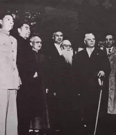 1957年5月,周恩来陪苏联最高苏维埃主席团主席伏罗希洛夫拜访马一浮,左一为省长沙文汉,左二周恩来,左三蒋国榜。