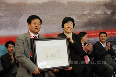开幕式上,我院党委书记钱晓芳、省文化厅副厅长来颖杰分别宣读了国务委员刘延东同志的贺信以及文化部副部长王文章同志的讲话,省委宣传部副部长、省文联党组书记吴天行、许江院长和学生代表李青也分别在开幕式上做了讲话。钱晓芳书记还就中国美术学院林风眠艺术基金的开设向广东威华集团董事长李建华颁发了感谢状。