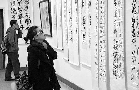 于是,当记者昨天在中国美院的美术馆里,看到全国12所高等院校的书法专业本科生的360幅作品展时,颇有点惊讶。这些院校不仅有像中国美院、鲁迅美术学院、湖北美术学院这样的艺术类院校,有北京师范大学这样的师范类学校,还有浙江大学、暨南大学这样的综合类院校,甚至还有南京航空航天大学这样的专业学院。
