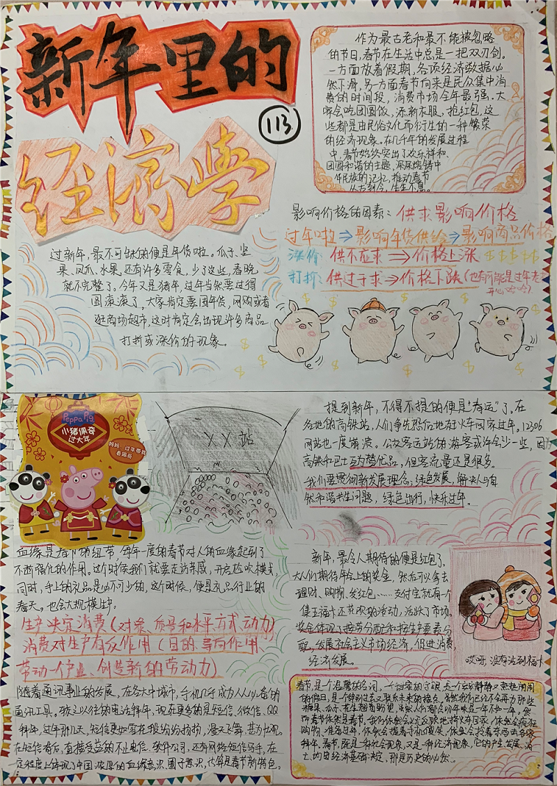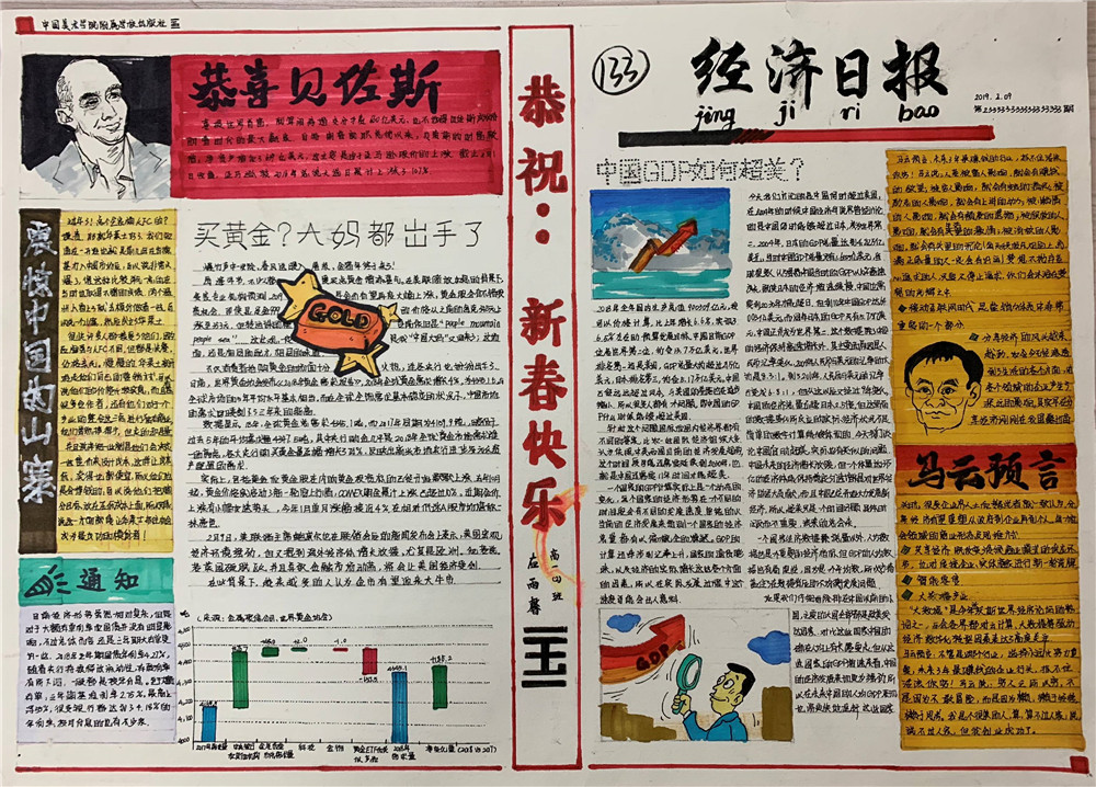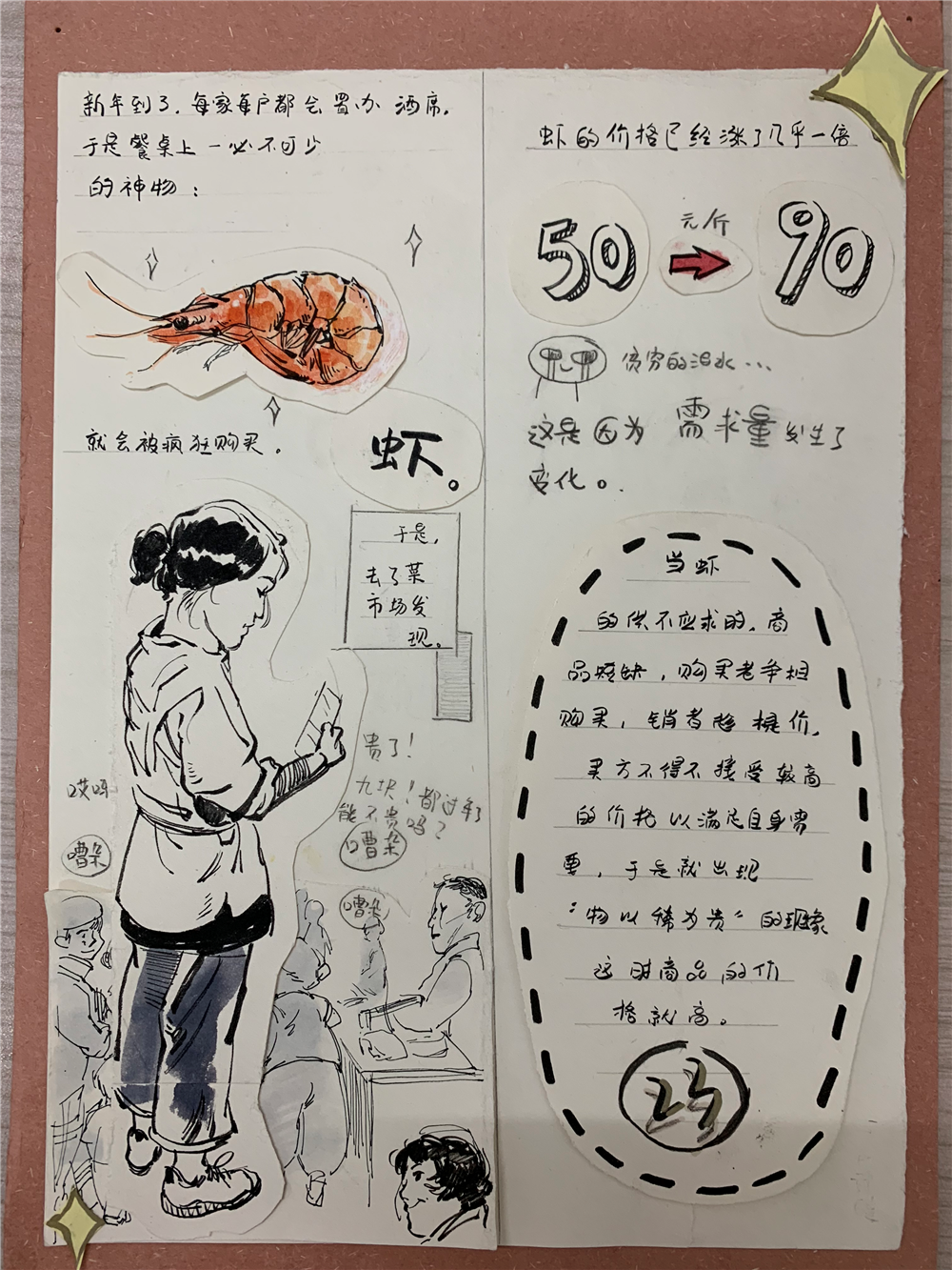 佛教禅宗思想中将文字分为活字和死字:用于记载一件事的文字是死字,而当人对事物有了亲身体验后,再讲出来就是活字。读过一本书、学过一种知识,并不是终点,只有真正踏上探索知识和体验生活之路后,书中的一行行死字才会变成活字。书中给我们介绍了很多受益终生的知识,要想这些知识能够内化成我们的自觉,必须积极主动的去探索和发现,用心体悟生活,感受理论和实践之间天然的关系。为了提升同学们学习理论的兴趣,培养理论联系实际的能力,附中分团委和政治教研室联合举办了名为“生活中的经济学”的手绘作业评比。附中学子利用假期,善于运用自己善于发现的眼睛和灵敏的洞察力解码生活中的经济现象。