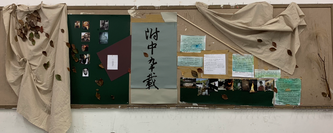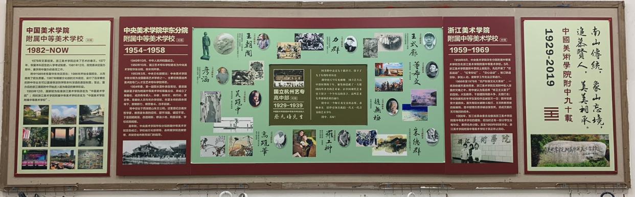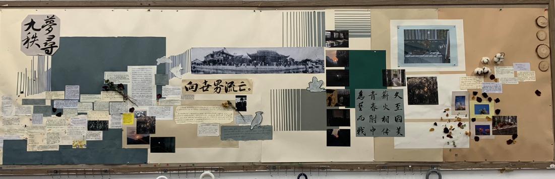 板报的中央黑白全景照,是当时美院仍在孤山时学子们的合影。板报之所以会用许多干花点缀,是因为在我看来附中那陈旧却又经久不衰的美与干花干枯却又不失其本色的美有什么区别呢?它们虽不那么精致,却有着岁月的痕迹。板报上的照片,晚霞染红了天边,树木的枝干把天空分割微黄泛红的天空从间隙中透出,如鎏金般温暖,孤寂,却又美得独具风骨。漫步在夕阳的余晖中,我们会真切的感受到自己融入了附中。