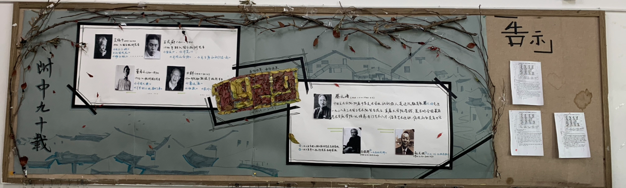 中国美术学院位于杭州,而杭州令人想起朦胧烟雨,清雅风韵,这次的板报以清新淡雅为主。左上角布置了二十世纪附中建校以来的旧报纸,意在代表附中的往昔岁月,营造年代感,右下角布置水岸山居的剪影,并以写有建校名人的毛边纸进行丰富和修饰,用照片作为整个板报的“点”,使视觉中心更加突出,整体更为丰富。