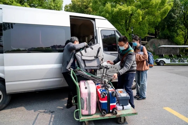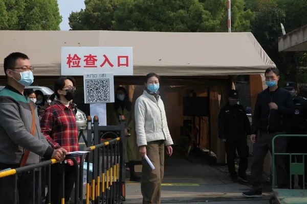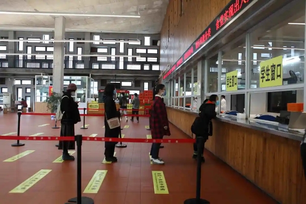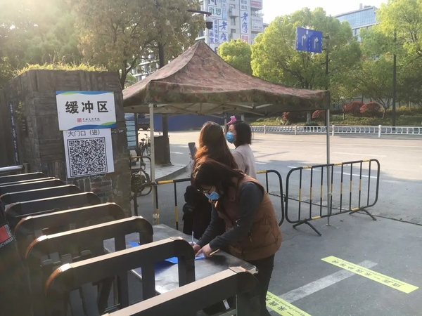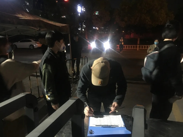 走读生家长送学生至学校南门后,在“家长接送签到表”签字。学生需要扫“进校二维码”,显示为校园绿码后,进行下一步体温测量,体温正常方可进校。走读生放学时,扫“离校码”出校门,由家长登记后接走。