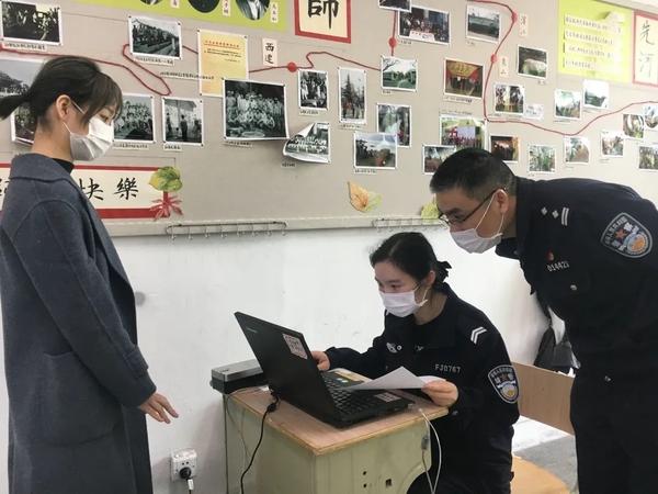 由于校园封闭式管理,学生不可外出,学校特联系转塘派出所民警同志上门为丢失身份证的学生补办证件。陈民警、赵民警一行带着办证设备来到附中,为学生录取指纹,顺利完成了身份证办理流程。民警同志耐心细致的工作得到附中学生的好评点赞。
