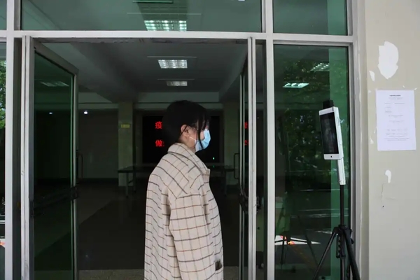 附中教学楼大门是学校疫情防控的第一道防线。正常上课后,每日晨午检入校时,学生戴好口罩,并保持一米间距,依次走到测温区,“刷脸”、测温,体温正常,无其它症状,方可进入校门。