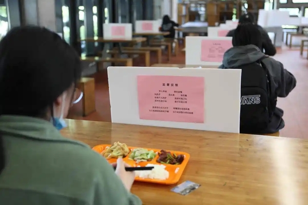 护航“开学第一餐”,饭菜飘香的餐厅,荤素搭配,营养健康。同学们自觉保持距离,不聚集、不闲谈,获取能量。全力备考!