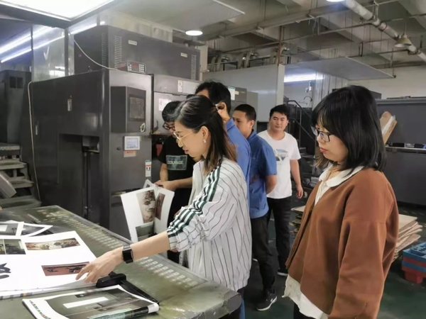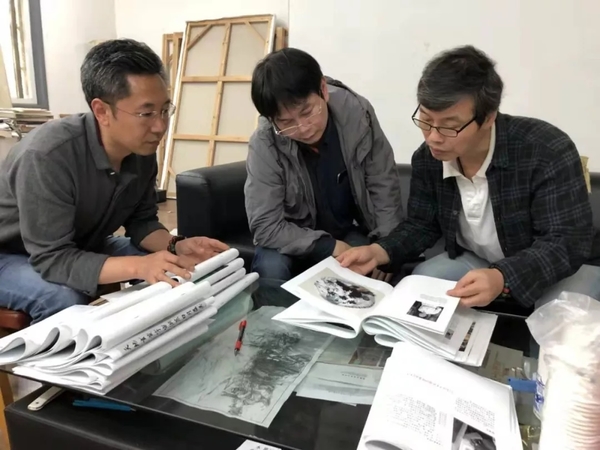 副校长张俊、原附中校长陈宁、教务科副科长杨怀武为《九秩芳华教师作品集》等数码样最后看样定稿