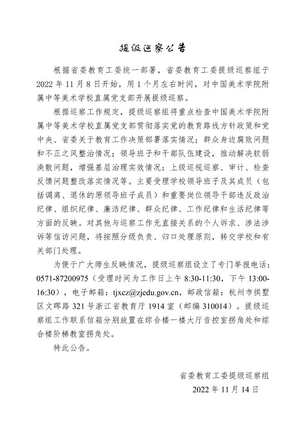 根据省委教育工委统一部署,2022年11月14日下午,省委教育工委提级巡察一组巡察中国美术学院附属中等美术学校直属党支部工作动员会议召开。会上,省委教育工委专职副书记、省教育厅党组副书记陈春雷作动员讲话;省委...